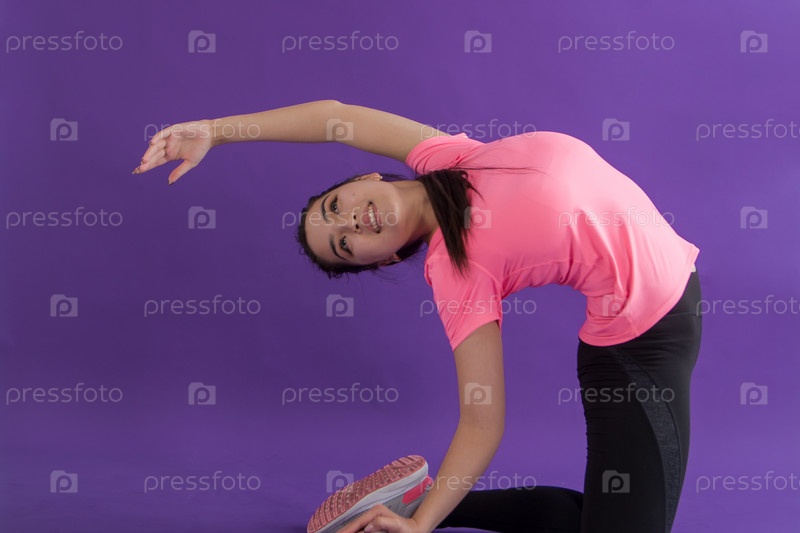 Девушка 25-30 лет со спортивной фигурой позирует в студии