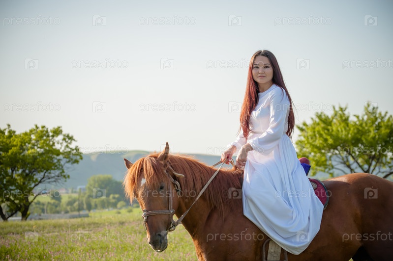 Кыргызская девушка азиатской национальности скачет на лошади в белом платье