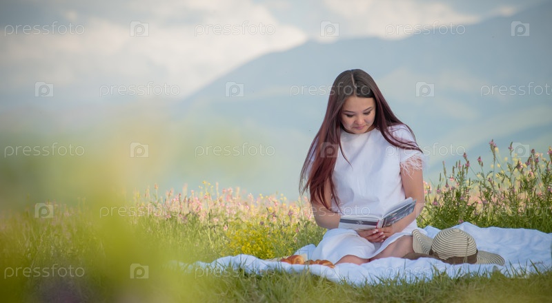 Девушка 20-25 лет весной и летом сидит в поле на природе на пикнике в шляпе и белом платье, ест фрукты и читает книгу