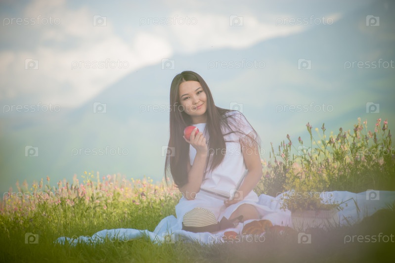 Девушка 20-25 лет весной и летом сидит в поле на природе на пикнике в шляпе и белом платье, ест фрукты и читает книгу