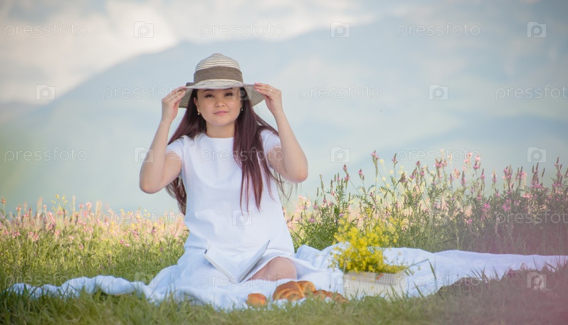 Девушка 20-25 лет весной и летом сидит в поле на природе на пикнике в шляпе и белом платье, ест фрукты и читает книгу
