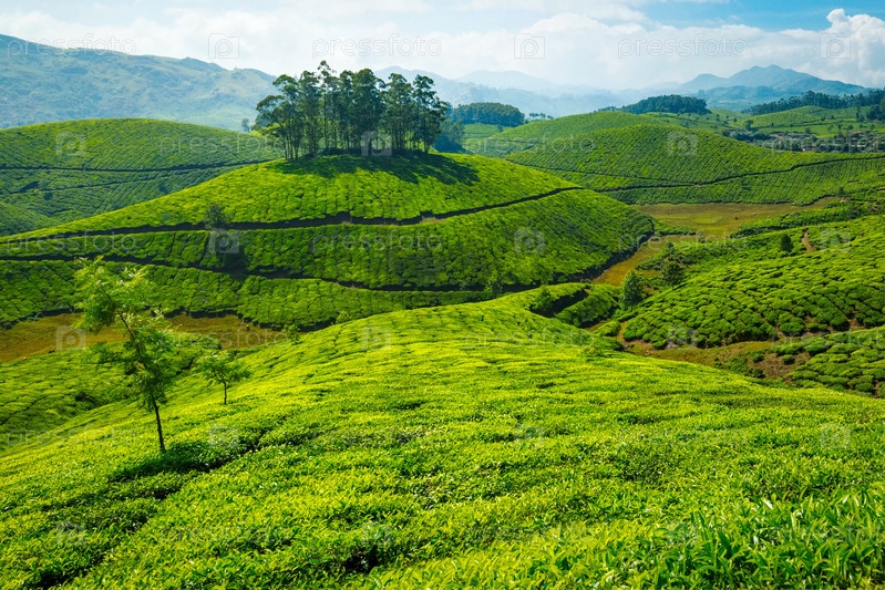 Зеленые холмы с чайными плантациями. Муннар, Керала, Индия