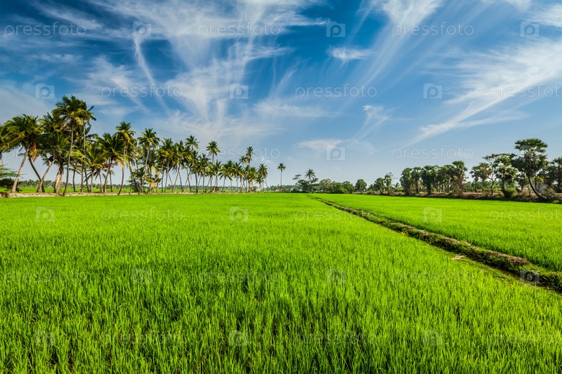 Сельская индийская сцена - рисовые поля и пальмы. Тамил Наду, Индия