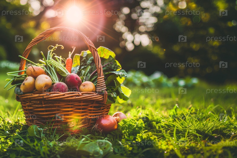 Корзина со свежими овощами (морковь, картофель, свекла, зелень) в саду на солнечном лугу