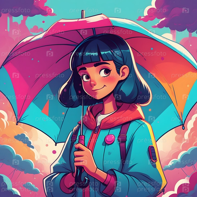 Девушка с красочным зонтиком в руках бегает и играет в весеннем парке под легким дождем. Зонтичная реклама, передающая радость весеннего дождя и игр на свежем воздухе