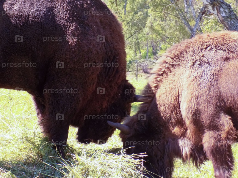 Зубр, корова и теленок, пасущиеся в начале лета, все еще демонстрируют участки своей тяжелой зимней шерсти с почти гладкой летней шкурой