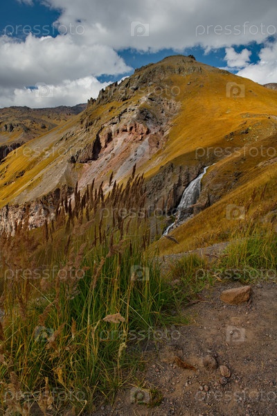 Россия, Северный Кавказ. Вид на грандиозный водопад Чиранбаши-Су (девичьи косы) на высоте 2800м у подножья горы Эльбрус в Кабардино-Балкарии