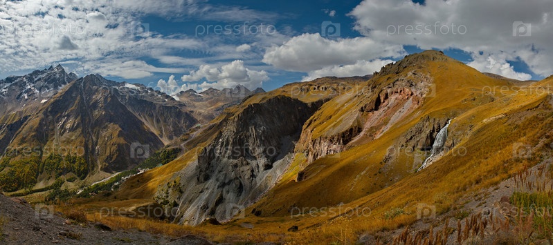 Россия, Северный Кавказ. Вид на грандиозный водопад Чиранбаши-Су (девичьи косы) на высоте 2800м у подножья горы Эльбрус в Кабардино-Балкарии