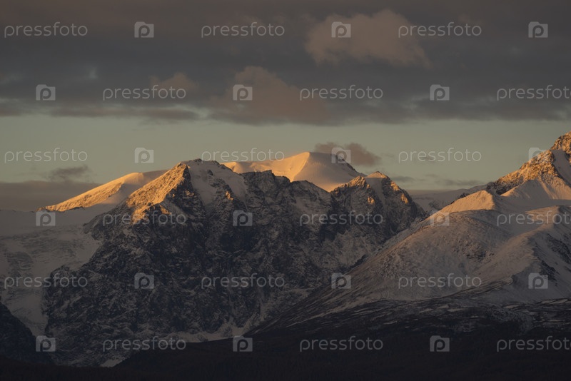 Россия. Юг Западной Сибири, горный Алтай. Освещенные багровым утренним светом вершины Северо-Чуйского хребта вдоль Чуйского тракта