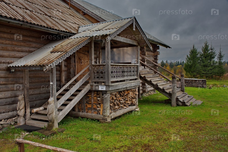 Россия, Карелия. Архитектура старинных бревенчатых крестьянских домов на берегу Онежского озера