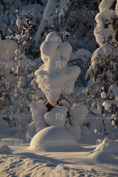 Россия, Горный Алтай. Заснеженные пихты в лучах закатного зимнего солнца