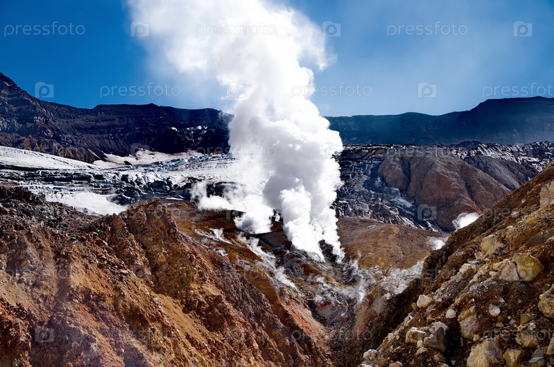 Россия. Полуостров Камчатка. Вулкан Мутновская Сопка уникален тем, что из кратера вулкана вытекает река, на берегах которой много дымящихся и бурлящих фумарол