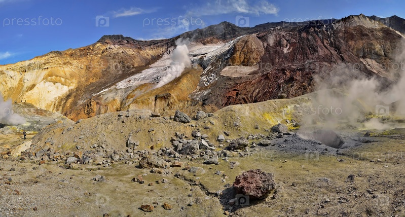Россия. Полуостров Камчатка. Вулкан Мутновская Сопка уникален тем, что из кратера вулкана вытекает река, на берегах которой много дымящихся и бурлящих фумарол