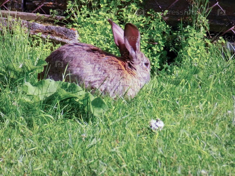 Большой серый кролик породы Фландр (бельгийский великан) на свободном выгуле