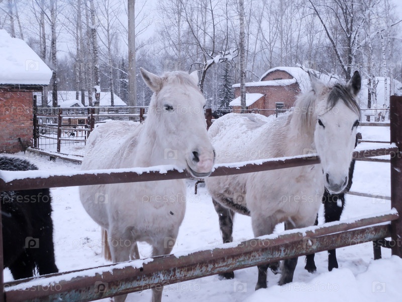 Белые лошади выглядывают из загона. Снято зимой