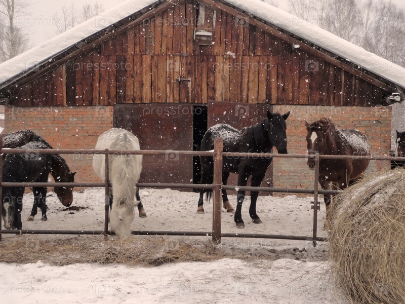 лошади выглядывают из загона. Снято зимой