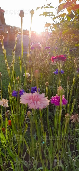 Поле васильков синего, фиолетового, розового, бордового и белого цветов