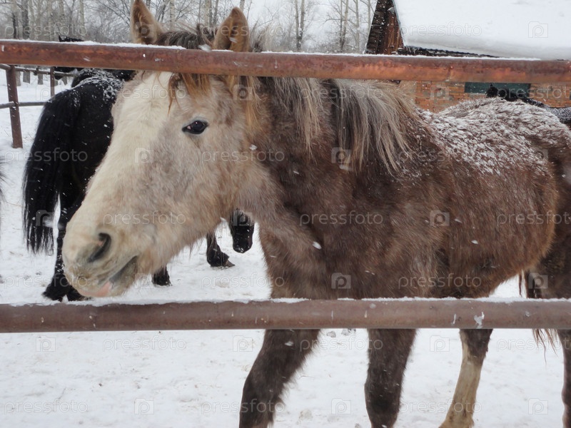 лошади выглядывают из загона. Снято зимой