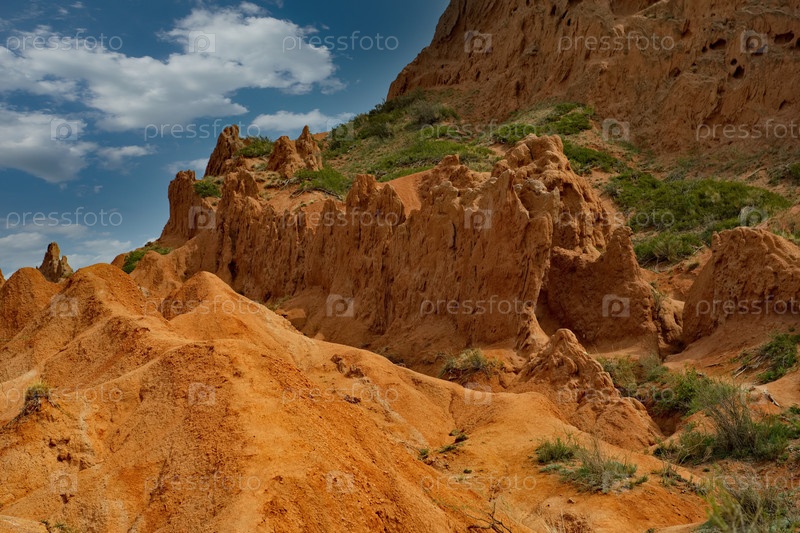 Северный Кыргызстан. Живописные виды знаменитого каньона Сказка, глинистые горные пики которого имеют яркие цвета от желтого до красно-коричневого