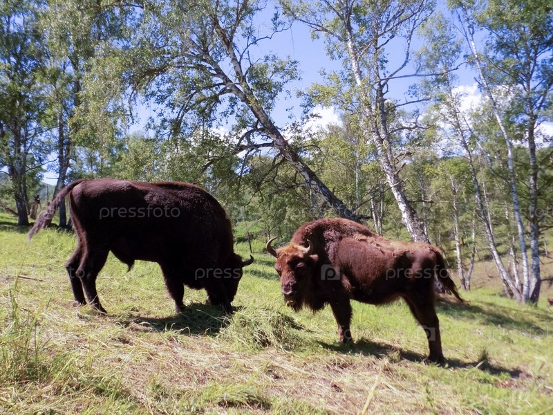 Зубр, корова и теленок, пасущиеся в начале лета, все еще демонстрируют участки своей тяжелой зимней шерсти с почти гладкой летней шкурой