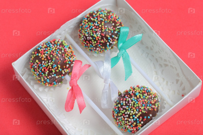 Кейк-попсы в шоколаде с цветной посыпкой. Украшен бантиком из ленты. Они лежат в подарочной коробке. На красном фоне