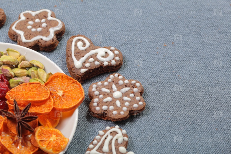 Пряники украшены узором из белой глазури. На фоне серой ткани. Украшен декоративными элементами из сухофруктов, палочками корицы и звездочками аниса