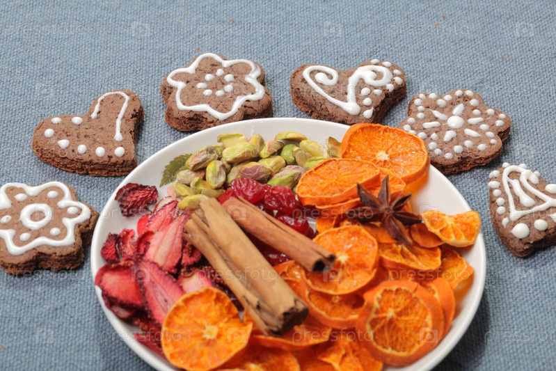 Пряники украшены узором из белой глазури. На фоне серой ткани. Украшен декоративными элементами из сухофруктов, палочками корицы и звездочками аниса