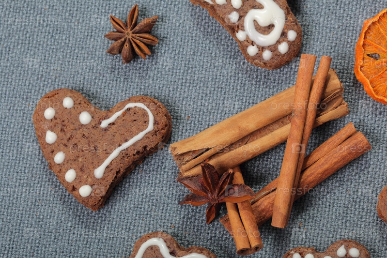 Пряники украшены узором из белой глазури. На фоне серой ткани. Украшен декоративными элементами из сухофруктов, палочками корицы и звездочками аниса