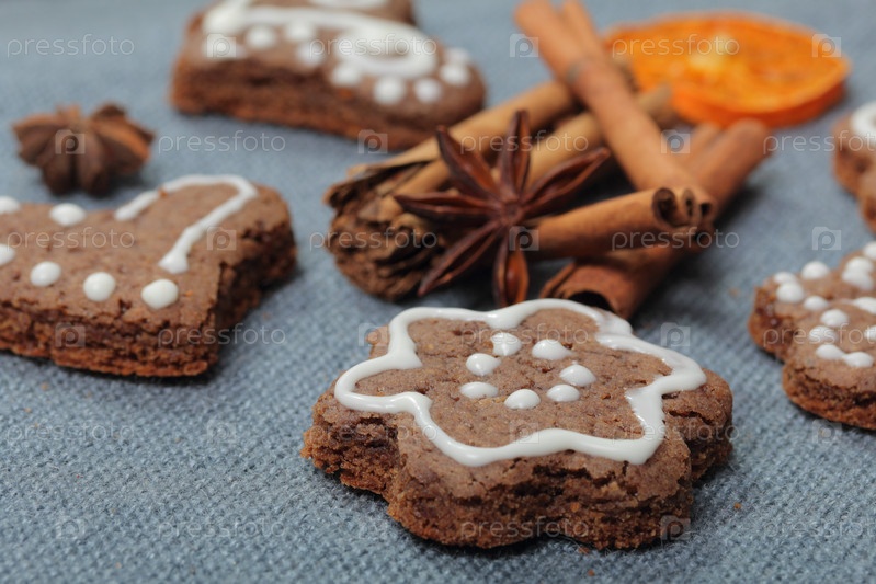 Пряники украшены узором из белой глазури. На фоне серой ткани. Украшен декоративными элементами из сухофруктов, палочками корицы и звездочками аниса