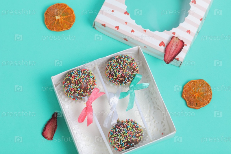 Кейк-попсы в шоколаде с цветной посыпкой. Украшен бантиком из ленты. Они лежат в подарочной коробке, в крышке которой имеется прозрачное окошко. Рядом лежат сухофрукты для украшения. На мятном фоне