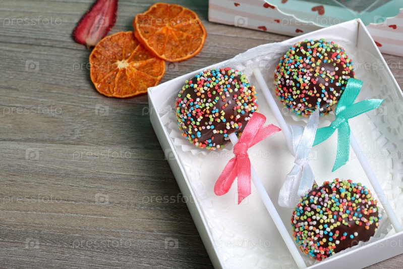 Кейк-попсы в шоколаде с цветной посыпкой. Украшен бантиком из ленты. Они лежат в подарочной коробке, в крышке которой имеется прозрачное окошко. Рядом лежат сухофрукты для украшения