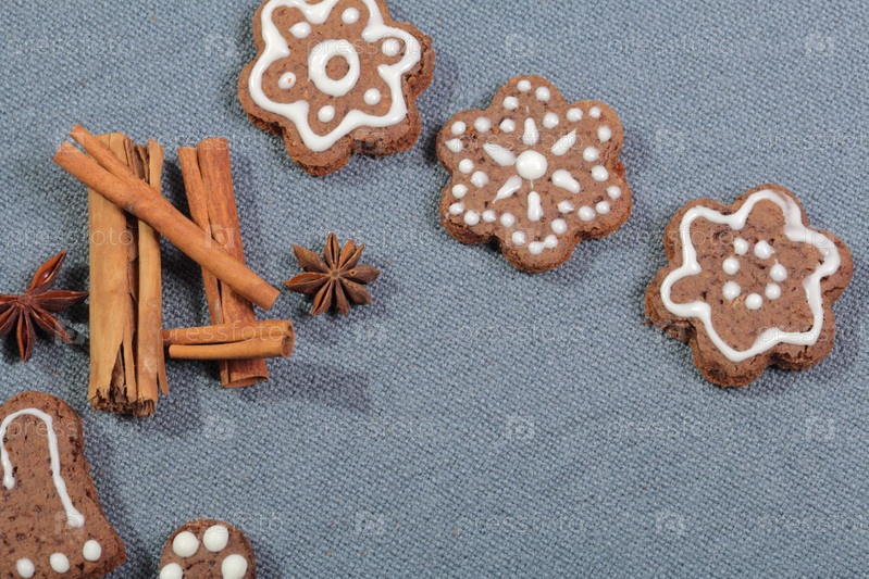 Пряники украшены узором из белой глазури. На фоне серой ткани. Украшен декоративными элементами из палочек корицы и звездочек аниса