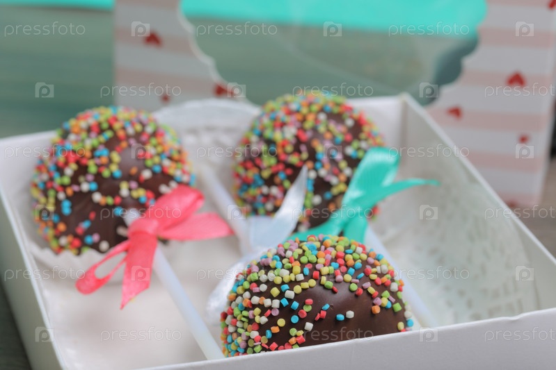 Кейк-попсы в шоколаде с цветной посыпкой. Украшен бантиком из ленты. Они лежат в подарочной коробке, в крышке которой имеется прозрачное окошко