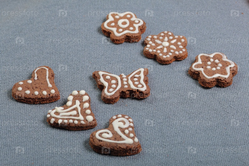 Пряники украшены узором из белой глазури. На фоне серой ткани