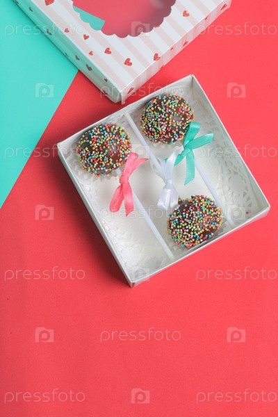 Кейк-попсы в шоколаде с цветной посыпкой. Украшен бантиком из ленты. Они лежат в подарочной коробке, в крышке которой имеется прозрачное окошко. На красно-мятном фоне