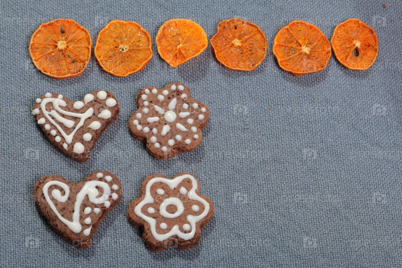 Пряники украшены узором из белой глазури. На фоне серой ткани. Украшен декоративными элементами из сухофруктов