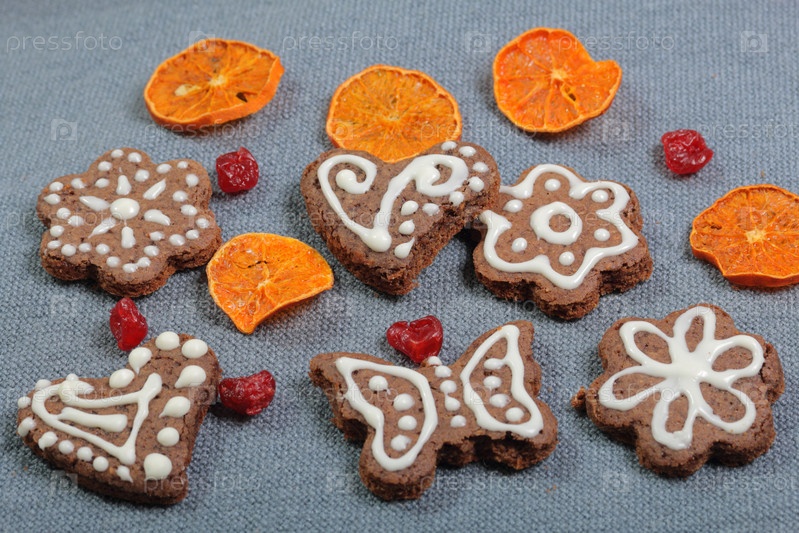 Пряники украшены узором из белой глазури. На фоне серой ткани. Украшен декоративными элементами из сухофруктов