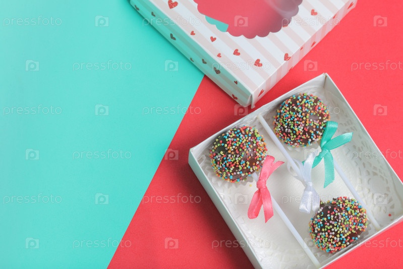 Кейк-попсы в шоколаде с цветной посыпкой. Украшен бантиком из ленты. Они лежат в подарочной коробке, в крышке которой имеется прозрачное окошко. На красно-мятном фоне