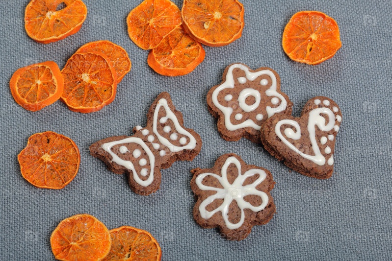 Пряники украшены узором из белой глазури. На фоне серой ткани. Украшен декоративными элементами из сухофруктов