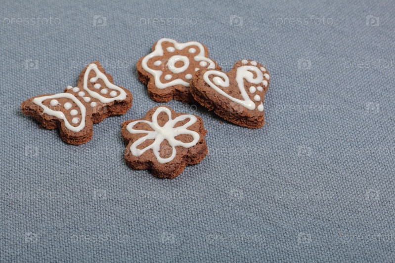 Пряники украшены узором из белой глазури. На фоне серой ткани