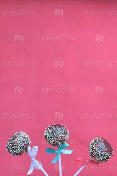 Кейк-попсы в шоколаде с цветной посыпкой. Украшен бантиком из ленты. На красном фоне