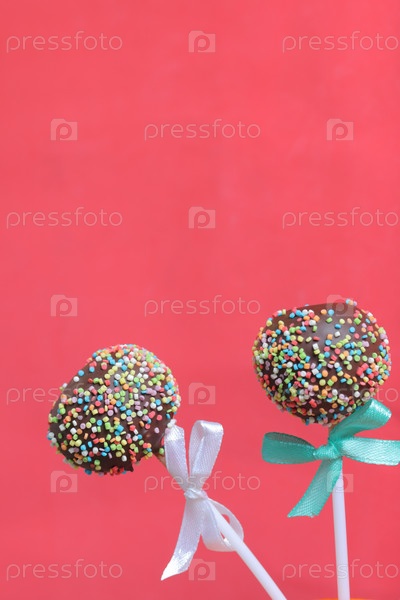Кейк-попсы в шоколаде с цветной посыпкой. Украшен бантиком из ленты. На красном фоне