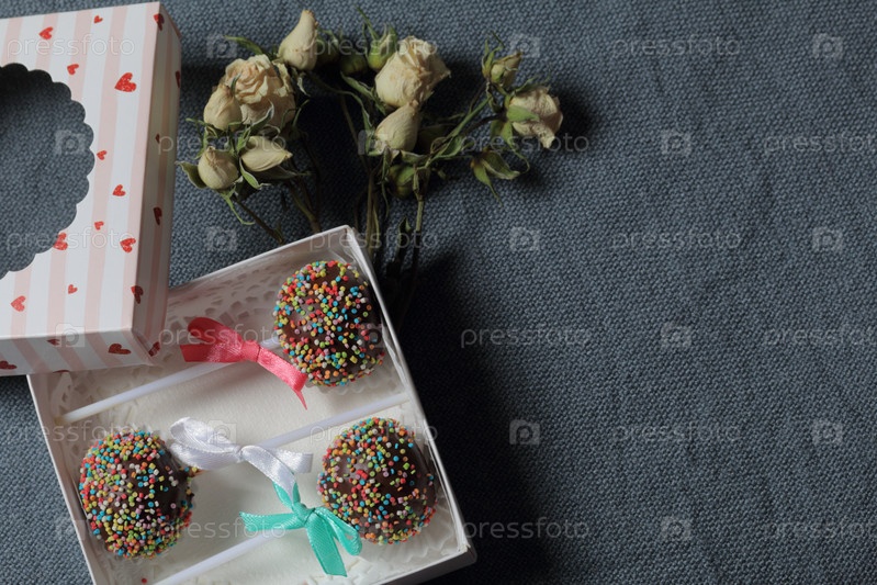 Кейк-попсы в шоколаде с цветной посыпкой. Украшен бантиком из ленты. Они лежат в подарочной коробке, в крышке которой имеется прозрачное окошко. Рядом лежат засохшие розы. На сером фоне