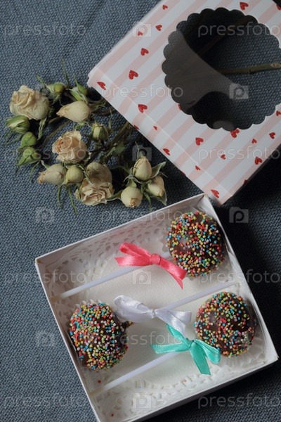 Кейк-попсы в шоколаде с цветной посыпкой. Украшен бантиком из ленты. Они лежат в подарочной коробке, в крышке которой имеется прозрачное окошко. Рядом лежат засохшие розы. На сером фоне
