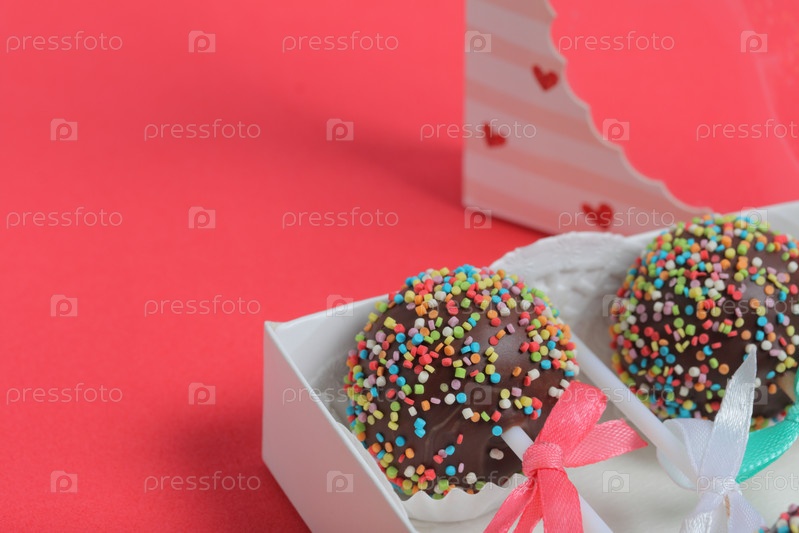 Кейк-попсы в шоколаде с цветной посыпкой. Украшен бантиком из ленты. Они лежат в подарочной коробке, в крышке которой имеется прозрачное окошко. На красном фоне