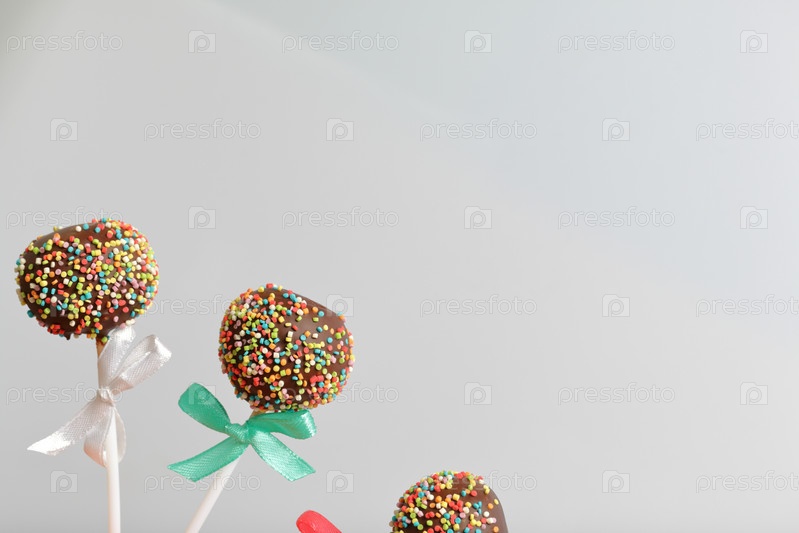 Кейк-попсы в шоколаде с цветной посыпкой. Украшен бантиком из ленты. На белом фоне