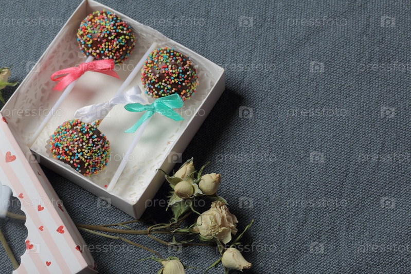 Кейк-попсы в шоколаде с цветной посыпкой. Украшен бантиком из ленты. Они лежат в подарочной коробке, в крышке которой имеется прозрачное окошко. Рядом лежат засохшие розы. На сером фоне