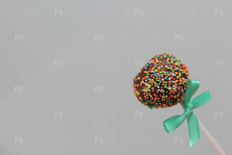 Кейк-попсы в шоколаде с цветной посыпкой. Украшен бантиком из ленты. На белом фоне