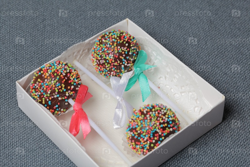Кейк-попсы в шоколаде с цветной посыпкой. Украшен бантиком из ленты. Они лежат в подарочной коробке. На сером фоне