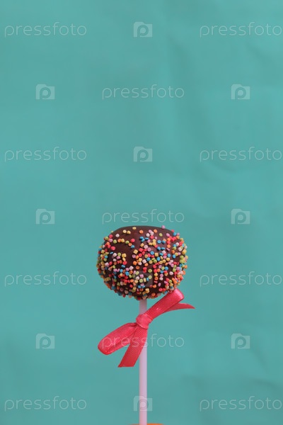 Кейк-попсы в шоколаде с цветной посыпкой. Украшен бантиком из ленты. На мятном фоне